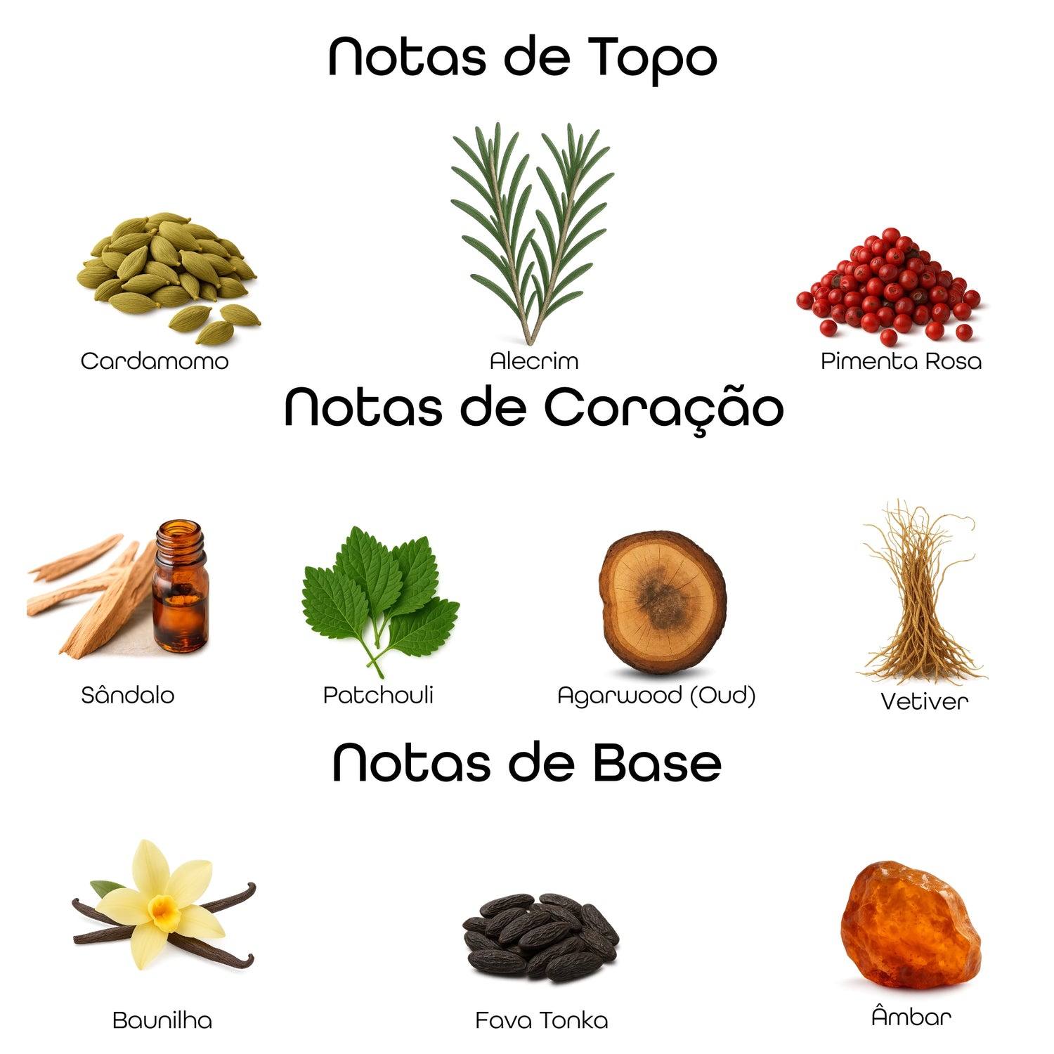 Essa combinação cria uma fragrância amadeirada quente, com toque especiado e fundo cremoso sofisticado.