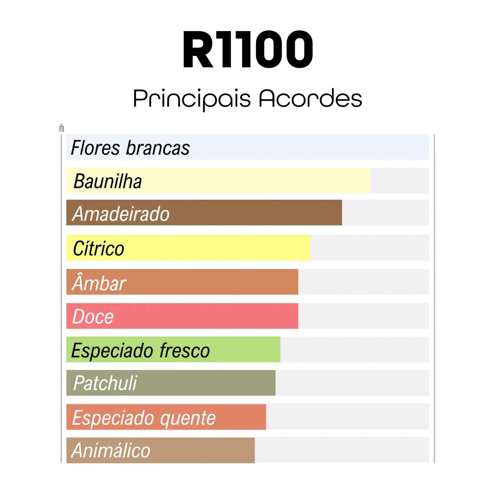 Elegante, moderno e confiante. R1100 combina lavanda fresca, patchouli e madeiras quentes em perfeita harmonia, criando uma fragrância equilibrada e envolvente.